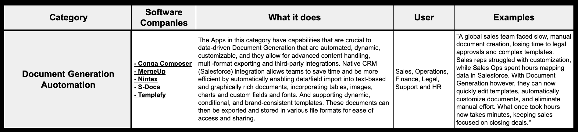 This App enables teams to automatically generate documents, and as an extension of that, to send documents for Electronic Signature. Conga is a large company with around 1,500 employees, which does more than just Document Generation. With the tagline of “Revenue Lifecycle” Conga offers other solutions for multiple divisions within a company - Contract Lifecycle Management (CLM), ‘Configure, Price and Quote’ (CPQ), Digital Commerce and Billing. Conga Composer is a Document Generation solution, which connects to Salesforce as well as other CRMs, because Conga has their own platform outside of Salesforce. Although all products for Salesforce are built natively within the Salesforce platform. Additional CRMs include: Hubspot, MSFT, Oracle and SAP, and recently Conga announced it is available on the AWS Marketplace.